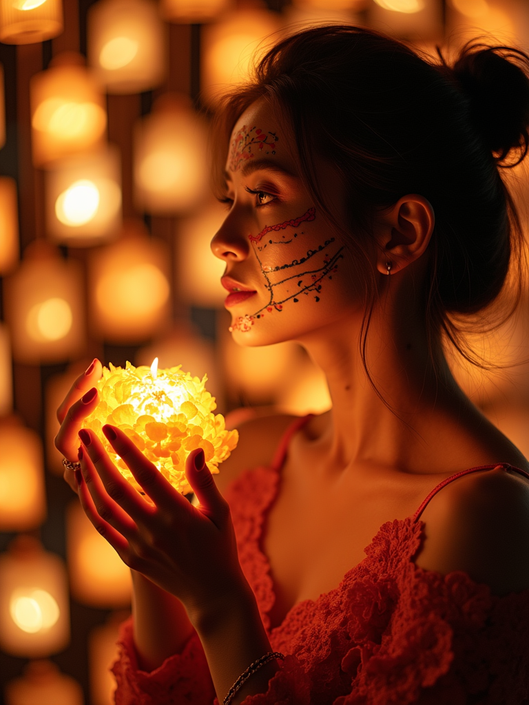 a model enjoying the Día de los Muertos atmosphere, with hands holding marigold flowers or candles , radiating respect and celebration of life