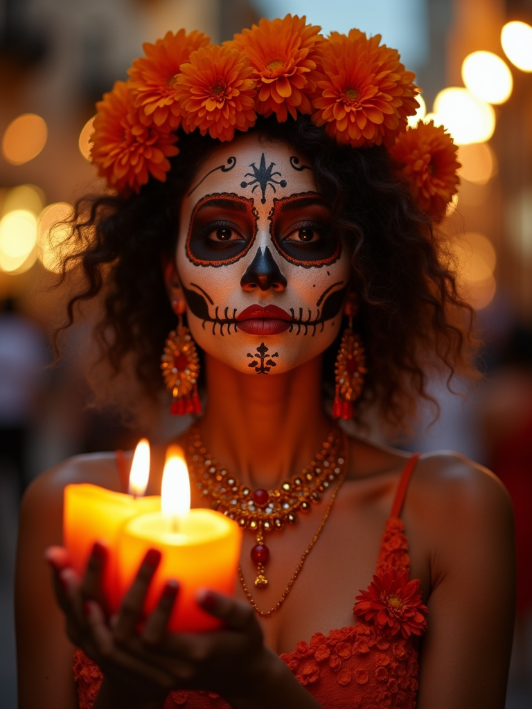 a model enjoying the Día de los Muertos atmosphere, with hands holding marigold flowers or candles , radiating respect and celebration of life
