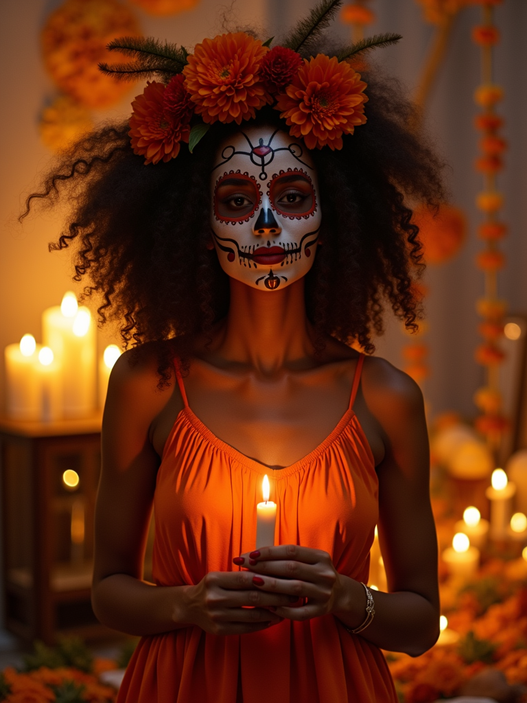 a model enjoying the Día de los Muertos atmosphere, with hands holding marigold flowers or candles , radiating respect and celebration of life