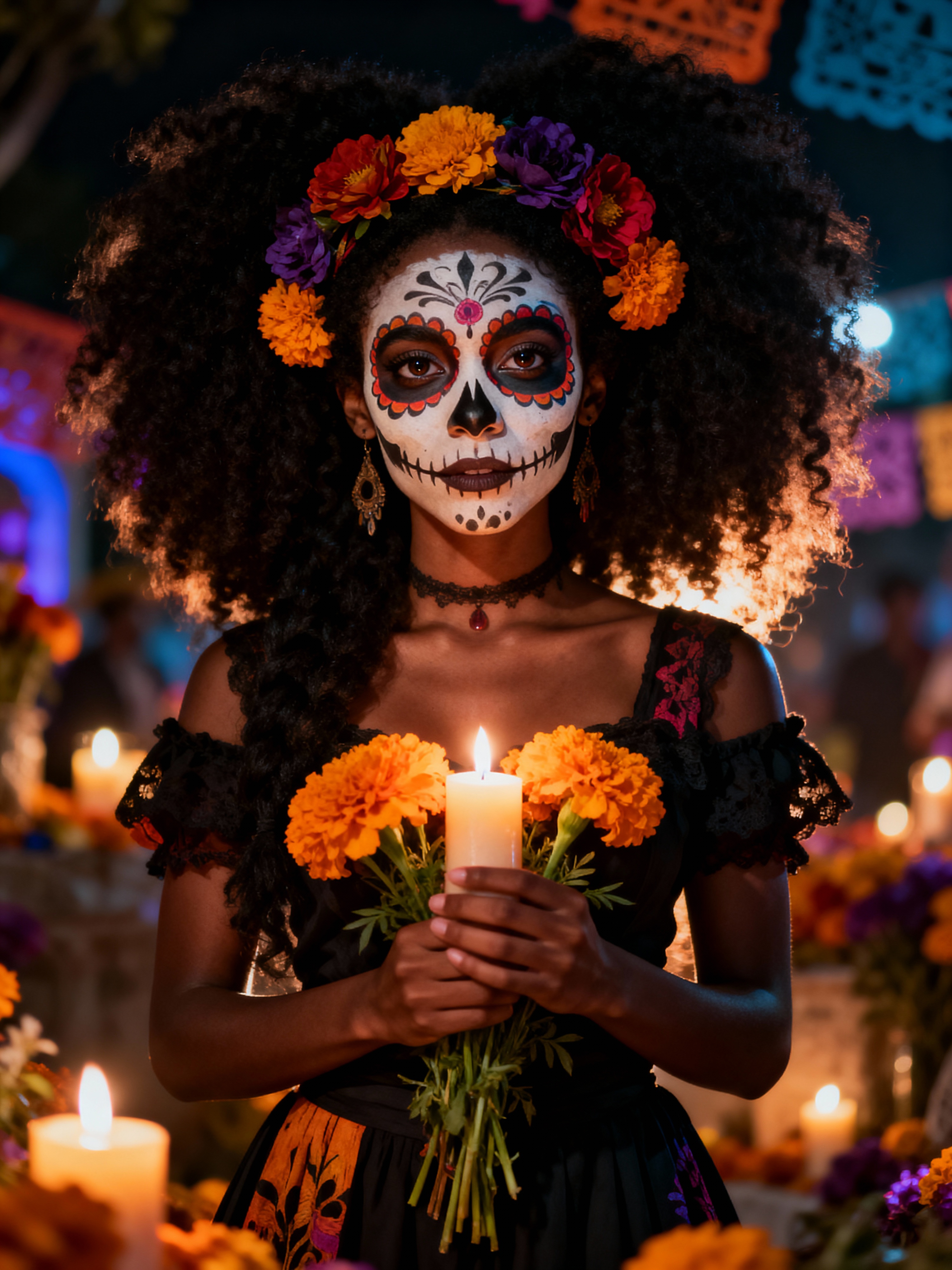 a model enjoying the Día de los Muertos atmosphere, with hands holding marigold flowers or candles , radiating respect and celebration of life