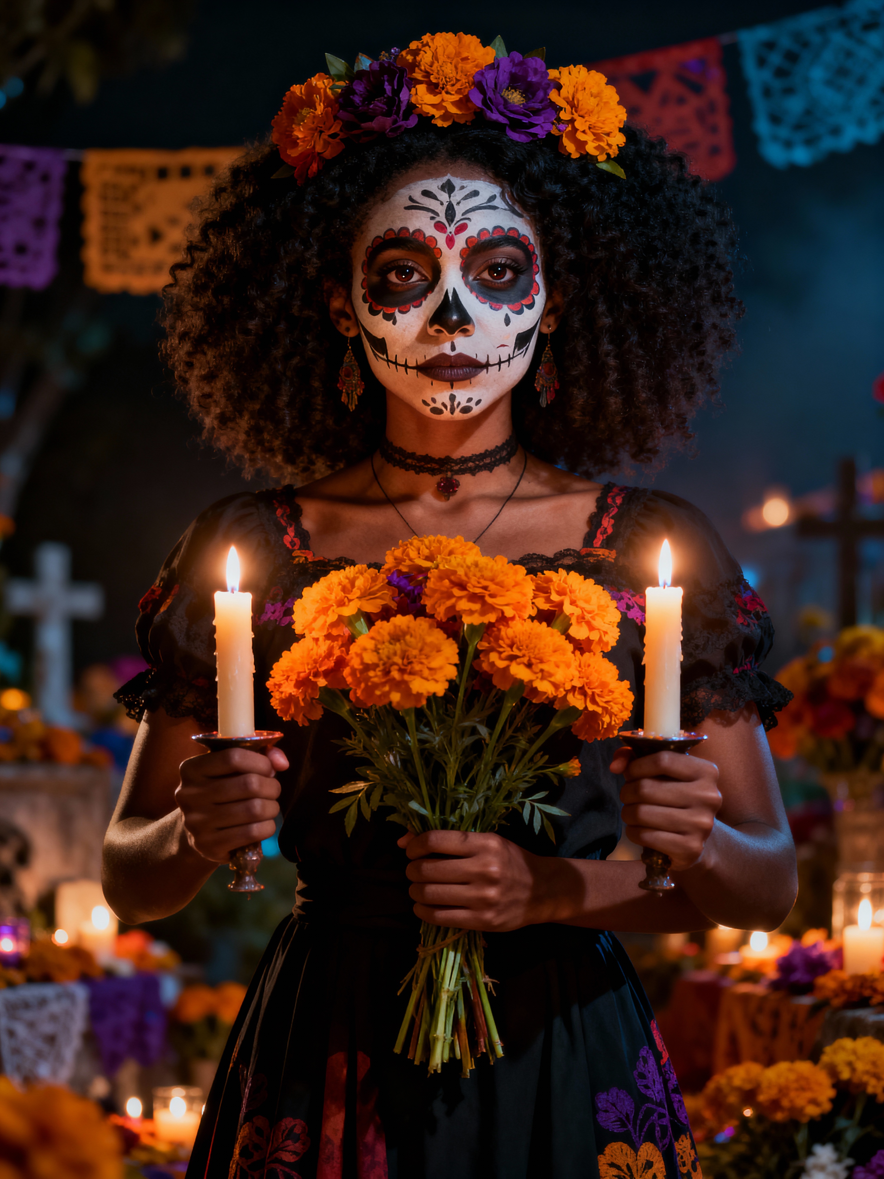 a model enjoying the Día de los Muertos atmosphere, with hands holding marigold flowers or candles , radiating respect and celebration of life