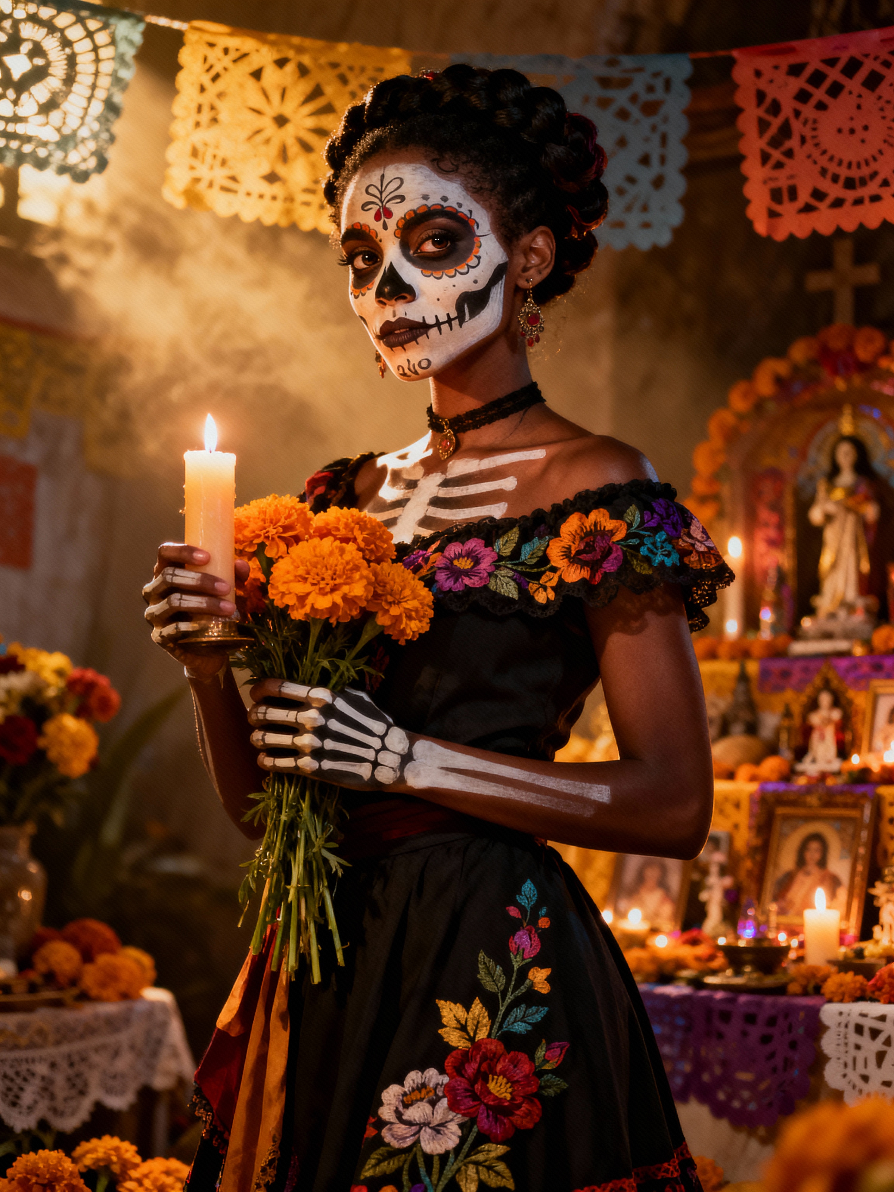 a model enjoying the Día de los Muertos atmosphere, with hands holding marigold flowers or candles , radiating respect and celebration of life