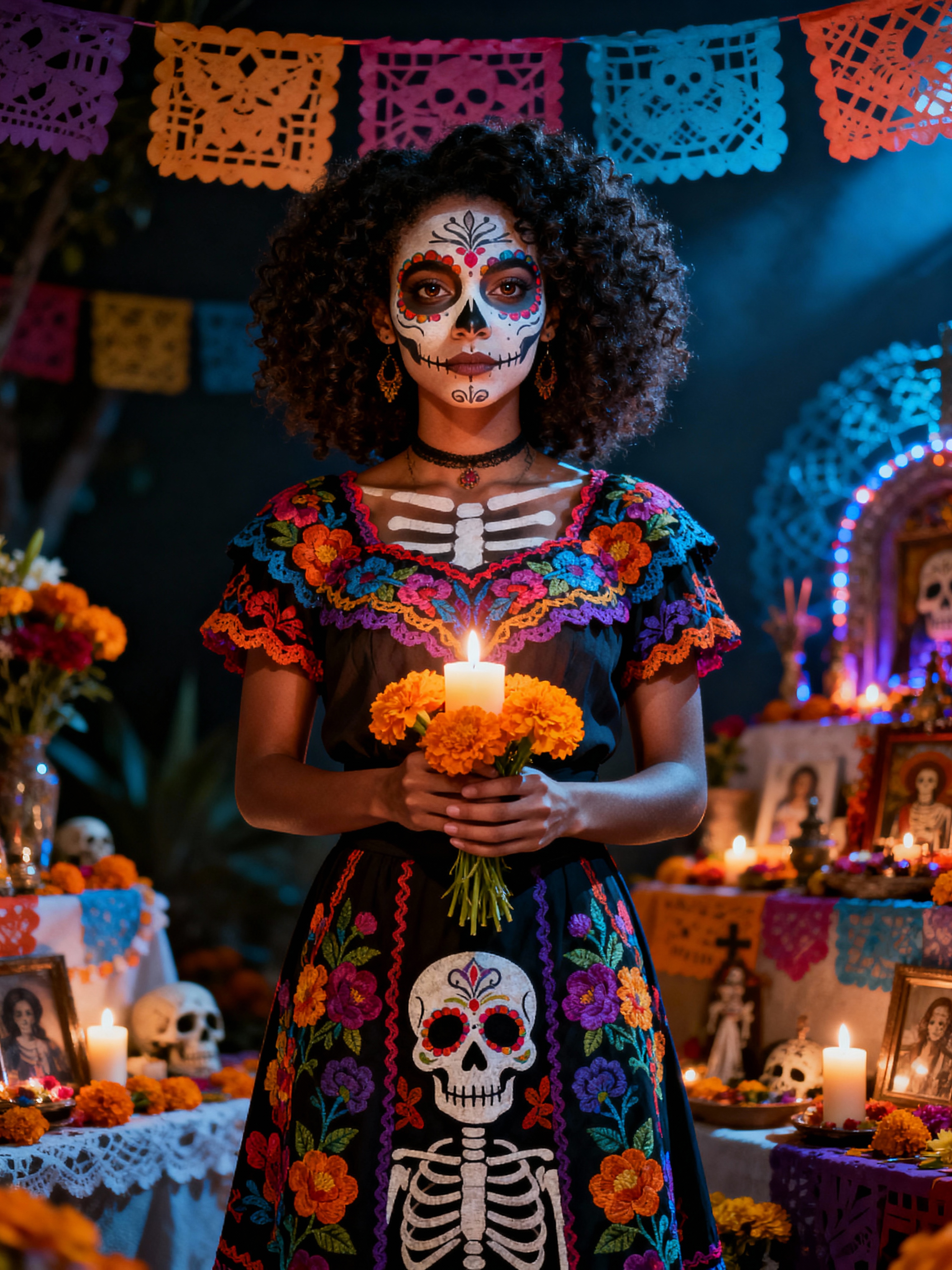 a model enjoying the Día de los Muertos atmosphere, with hands holding marigold flowers or candles , radiating respect and celebration of life
