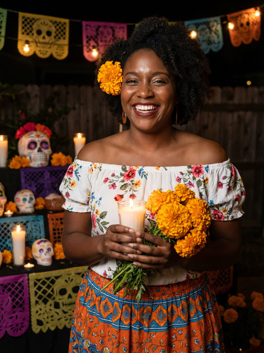 a model enjoying the Día de los Muertos atmosphere, with hands holding marigold flowers or candles , radiating respect and celebration of life