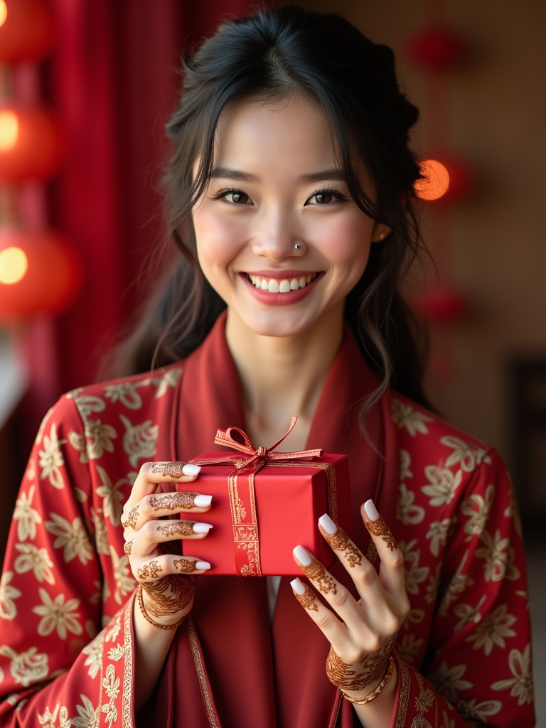 a model enjoying the Eid atmosphere, with hands decorated with henna and holding Eid gifts , radiating happiness and generosity