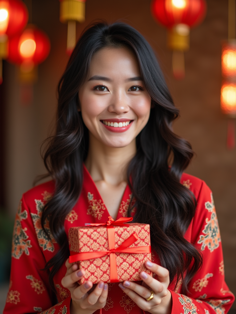 a model enjoying the Eid atmosphere, with hands decorated with henna and holding Eid gifts , radiating happiness and generosity