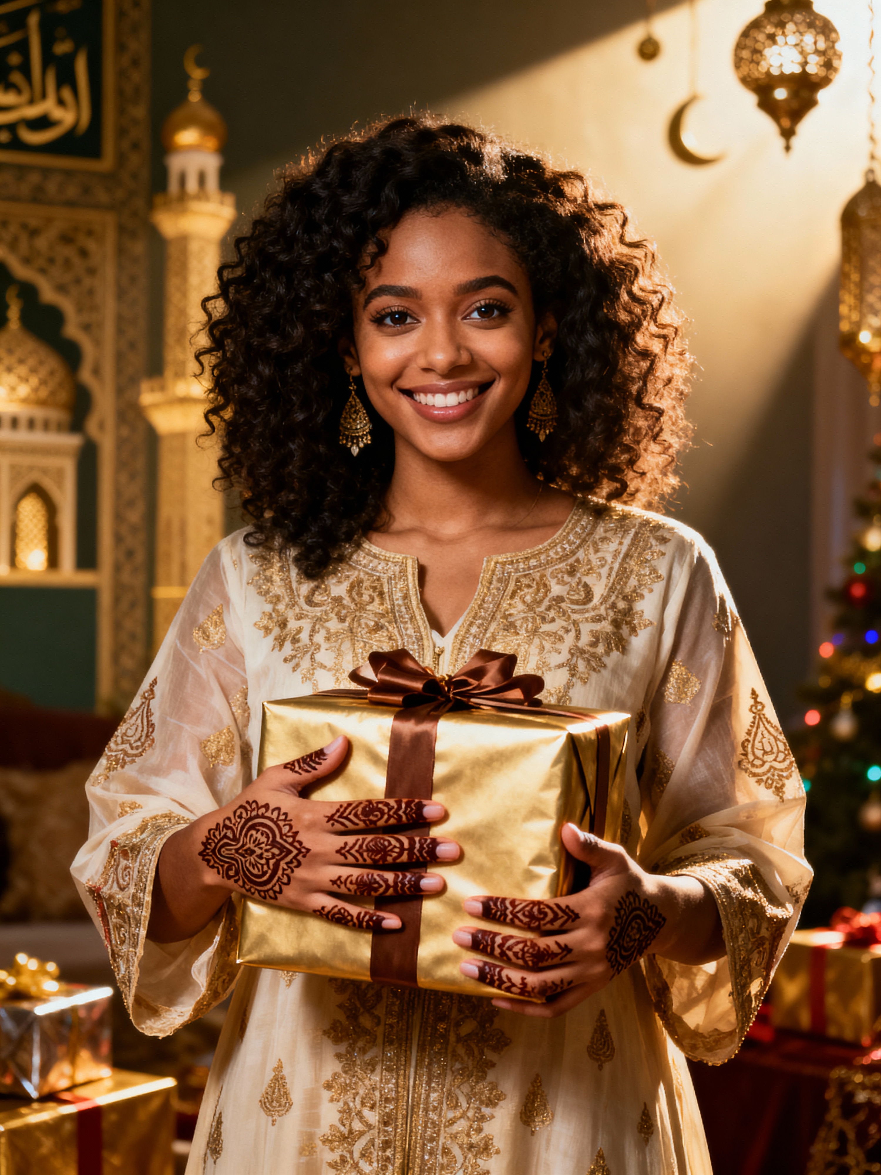 a model enjoying the Eid atmosphere, with hands decorated with henna and holding Eid gifts , radiating happiness and generosity
