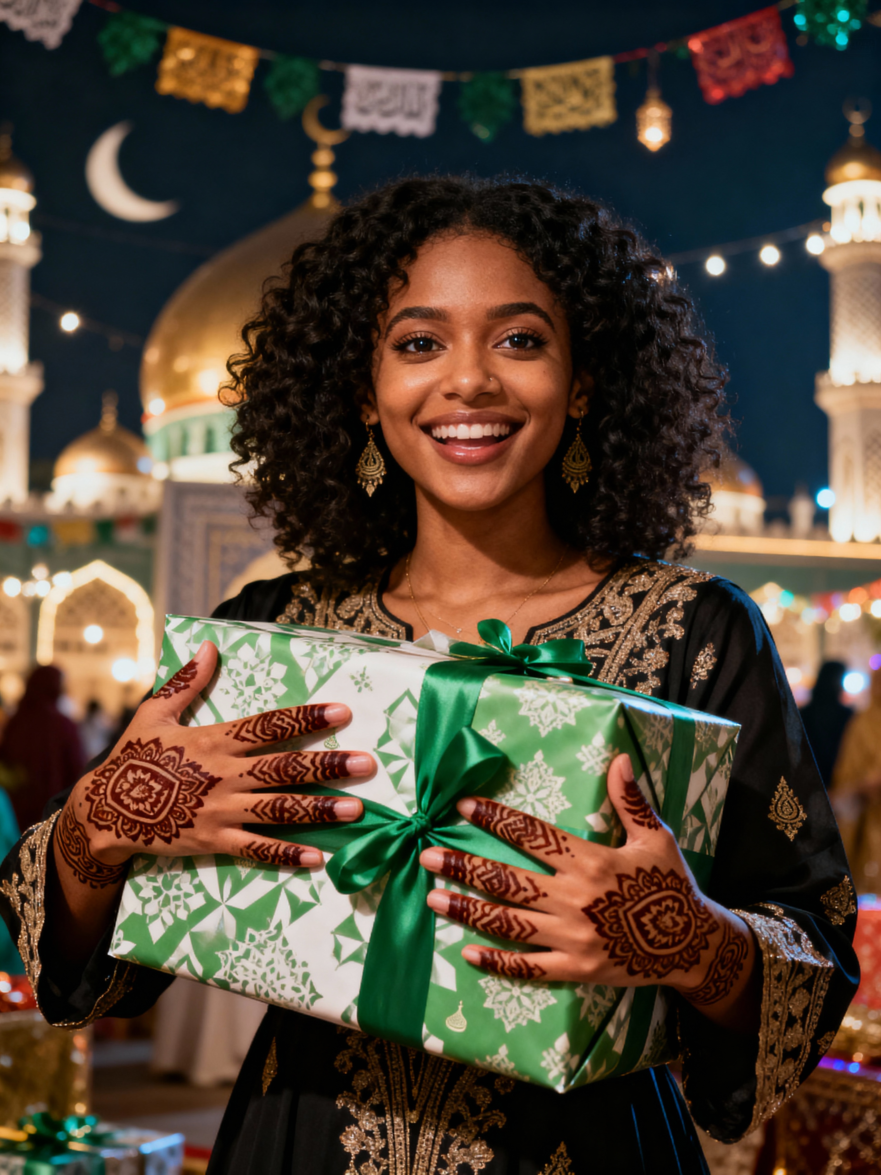 a model enjoying the Eid atmosphere, with hands decorated with henna and holding Eid gifts , radiating happiness and generosity