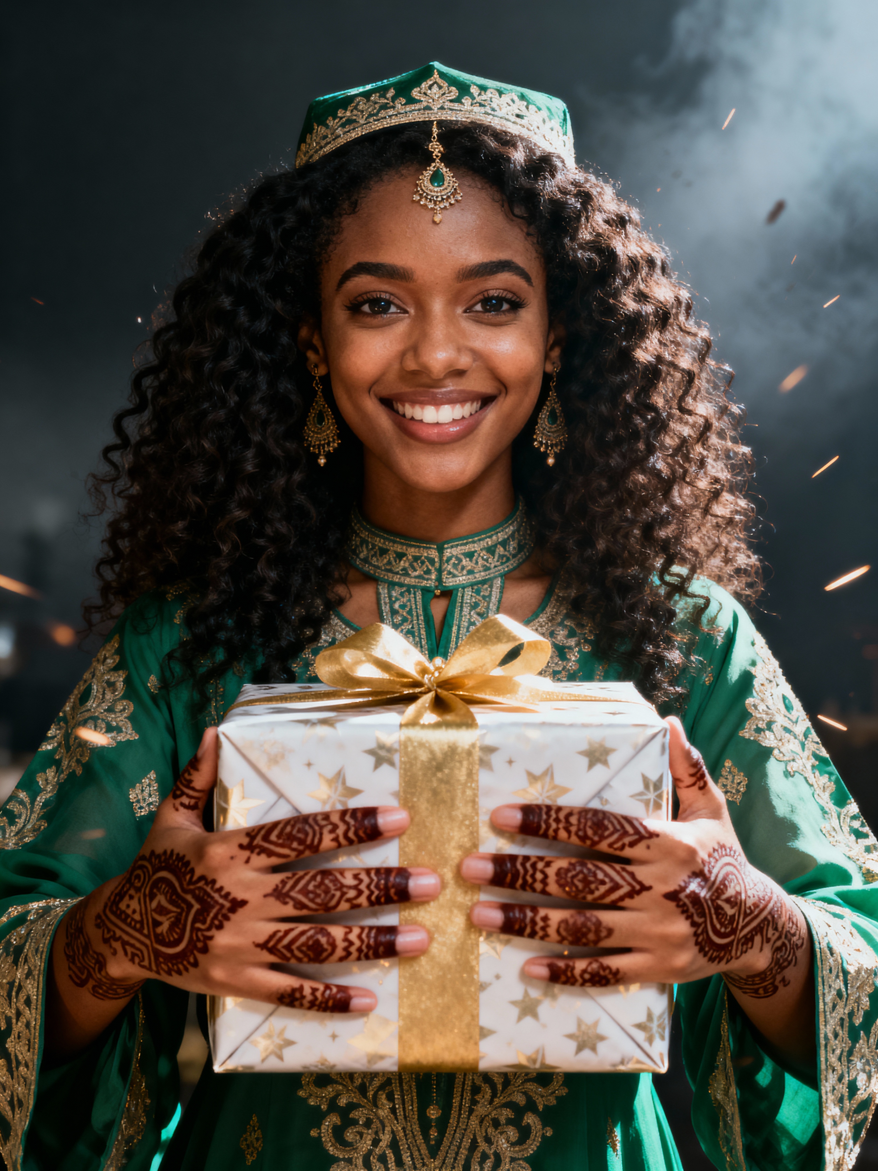 a model enjoying the Eid atmosphere, with hands decorated with henna and holding Eid gifts , radiating happiness and generosity