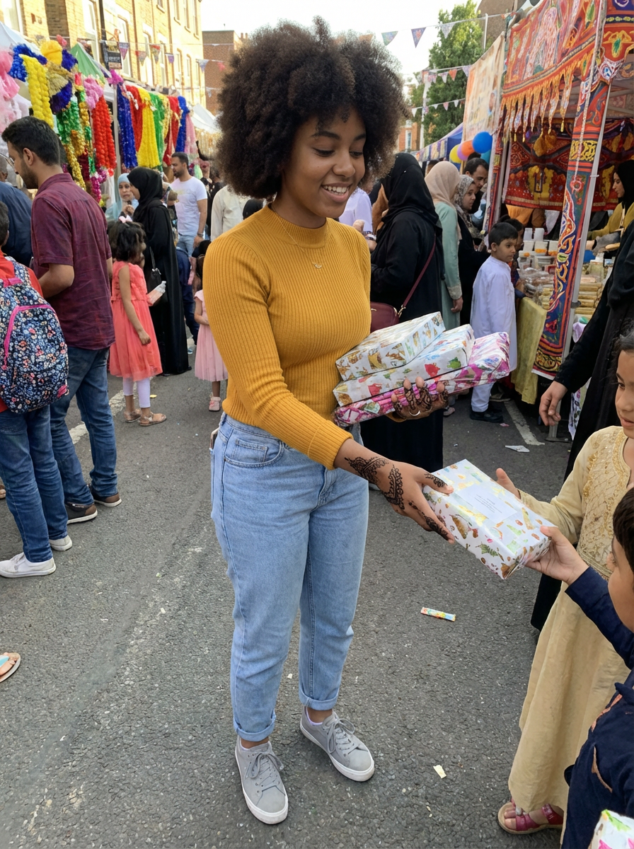a model enjoying the Eid atmosphere, with hands decorated with henna and holding Eid gifts , radiating happiness and generosity