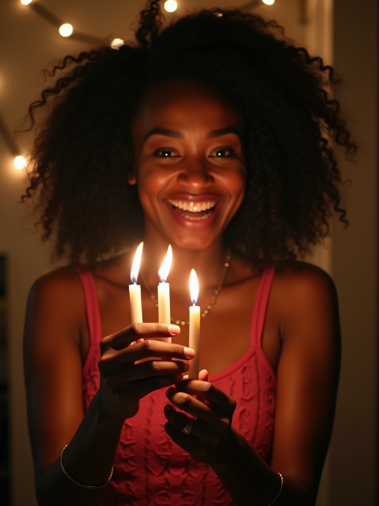 a model enjoying the Hanukkah atmosphere, with hands lighting the shamash candle , radiating happiness and spiritual connection