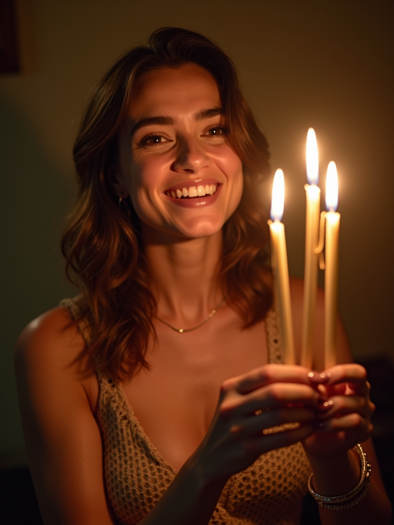 a model enjoying the Hanukkah atmosphere, with hands lighting the shamash candle , radiating happiness and spiritual connection
