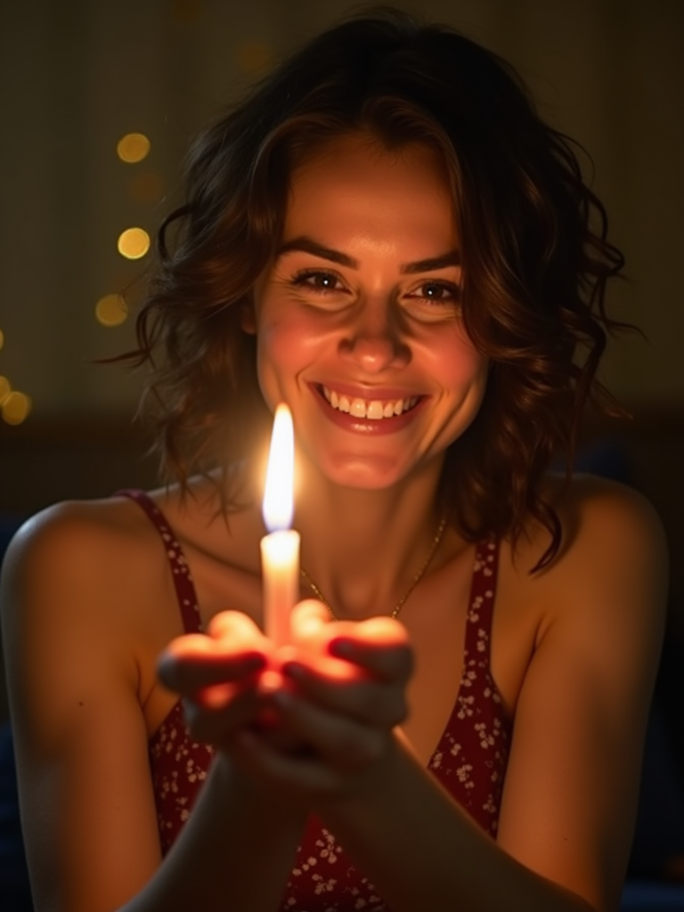 a model enjoying the Hanukkah atmosphere, with hands lighting the shamash candle , radiating happiness and spiritual connection