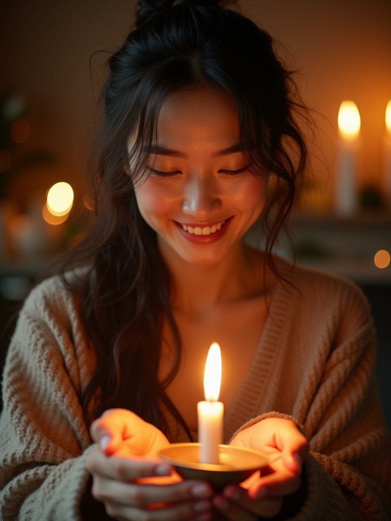 a model enjoying the Hanukkah atmosphere, with hands lighting the shamash candle , radiating happiness and spiritual connection