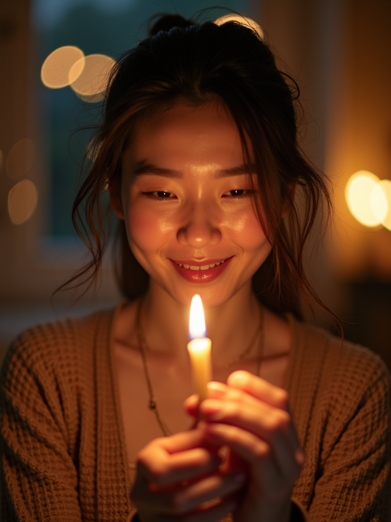a model enjoying the Hanukkah atmosphere, with hands lighting the shamash candle , radiating happiness and spiritual connection