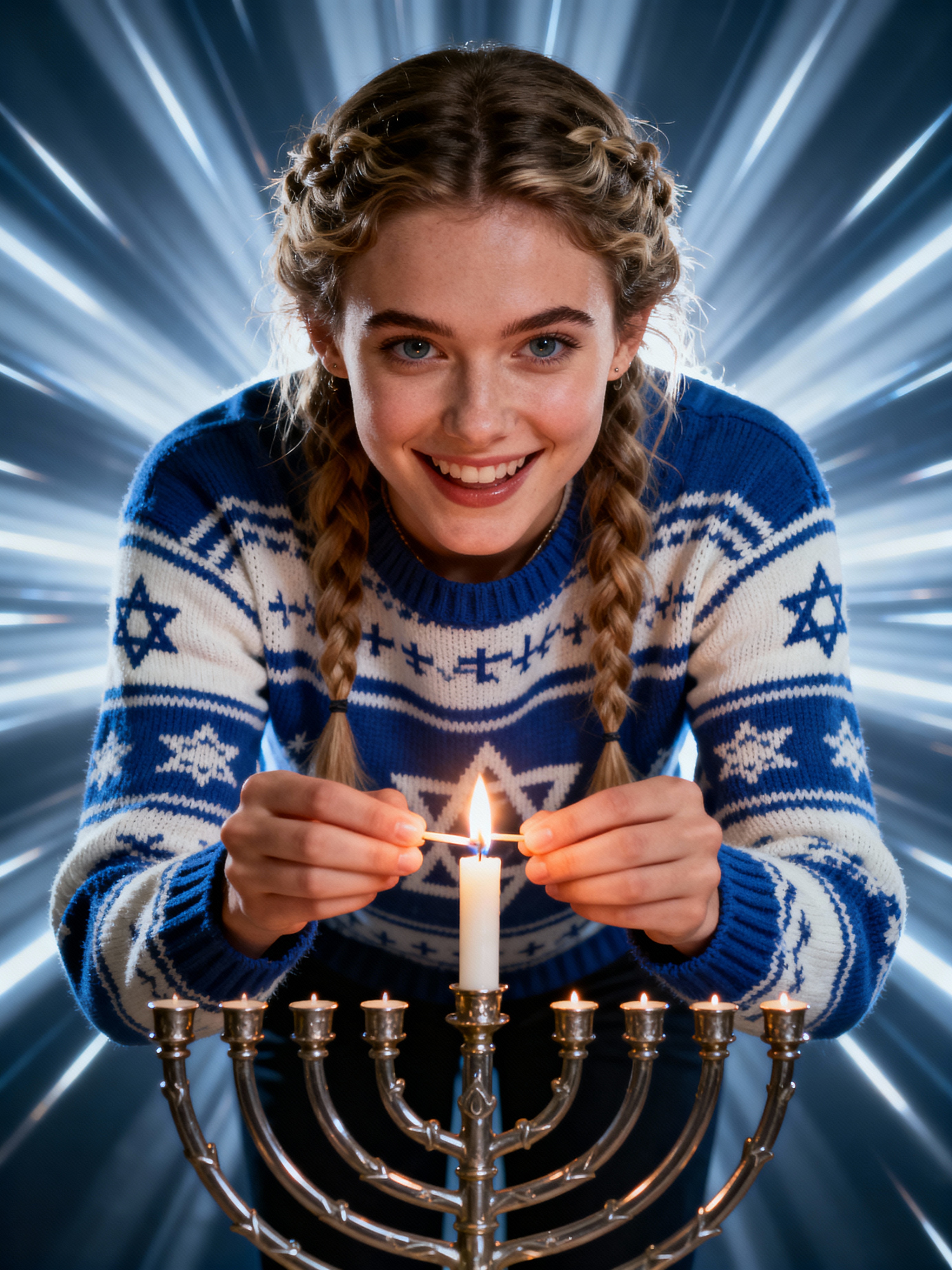 a model enjoying the Hanukkah atmosphere, with hands lighting the shamash candle , radiating happiness and spiritual connection