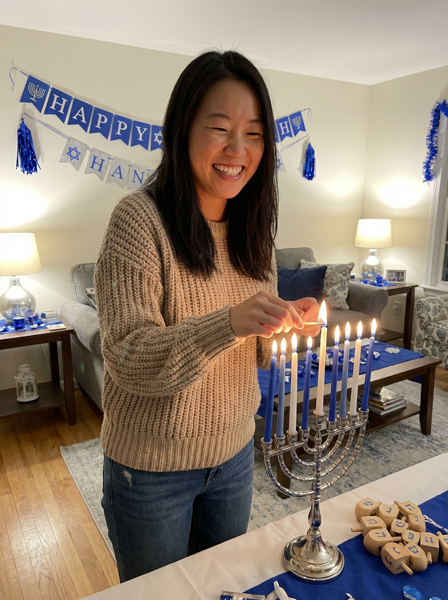 a model enjoying the Hanukkah atmosphere, with hands lighting the shamash candle , radiating happiness and spiritual connection