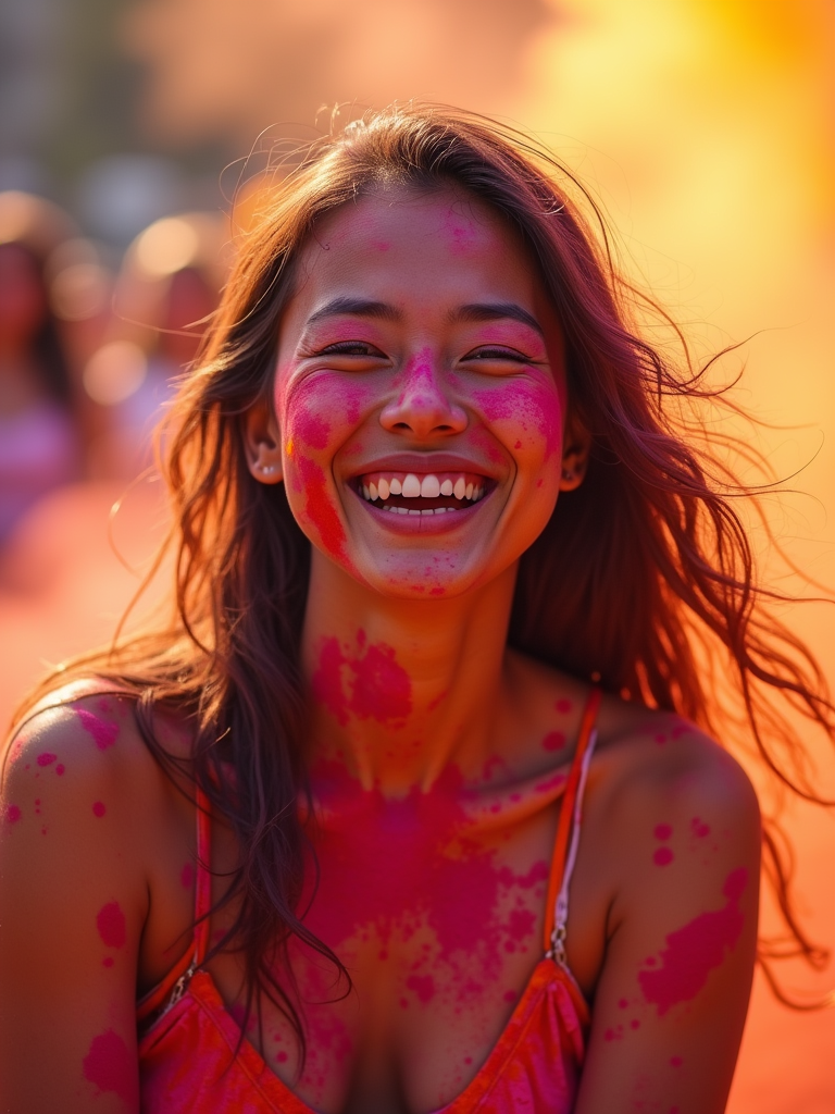 a model enjoying the Holi celebration, with colorful powder in her hair and on her smiling face , radiating joy under the bright festival lights