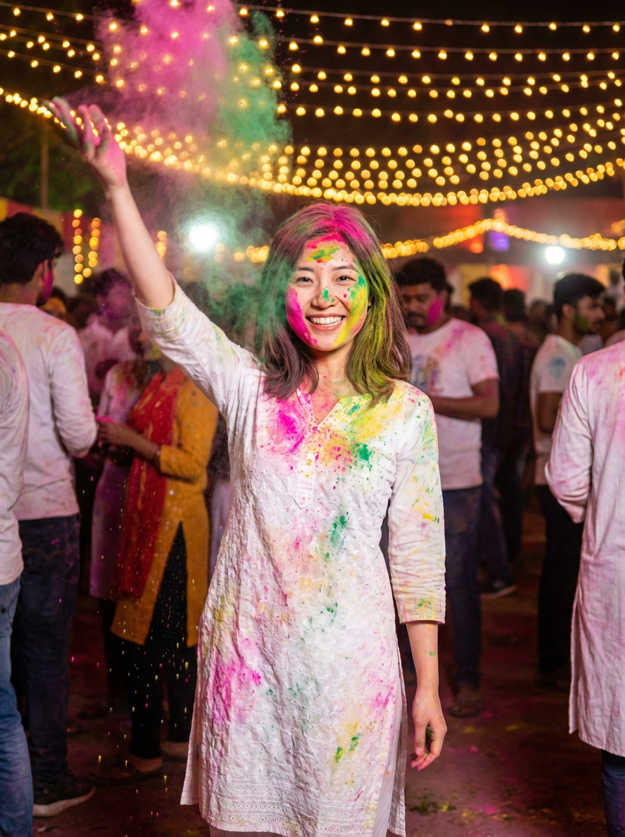 a model enjoying the Holi celebration, with colorful powder in her hair and on her smiling face , radiating joy under the bright festival lights
