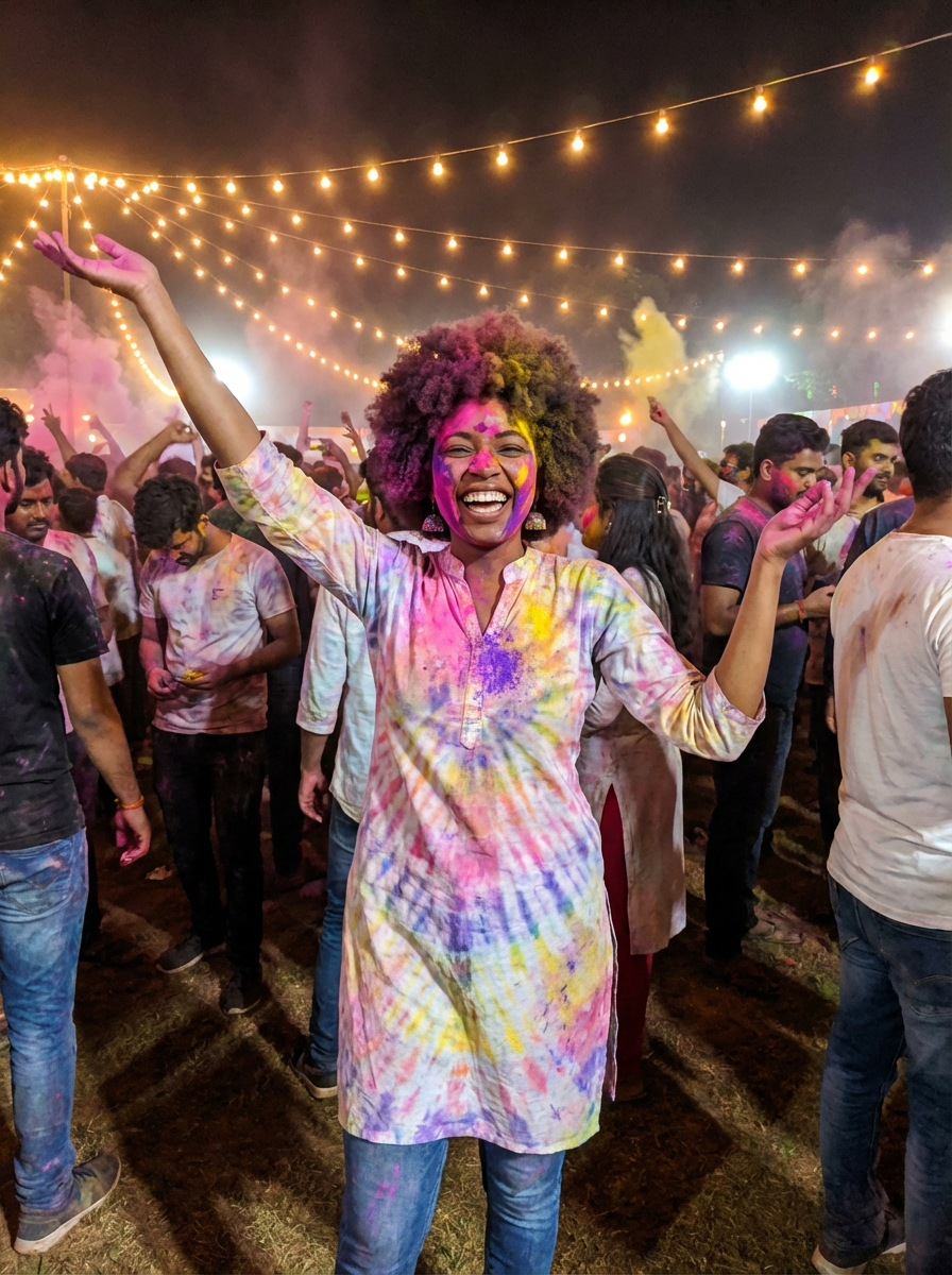 a model enjoying the Holi celebration, with colorful powder in her hair and on her smiling face , radiating joy under the bright festival lights