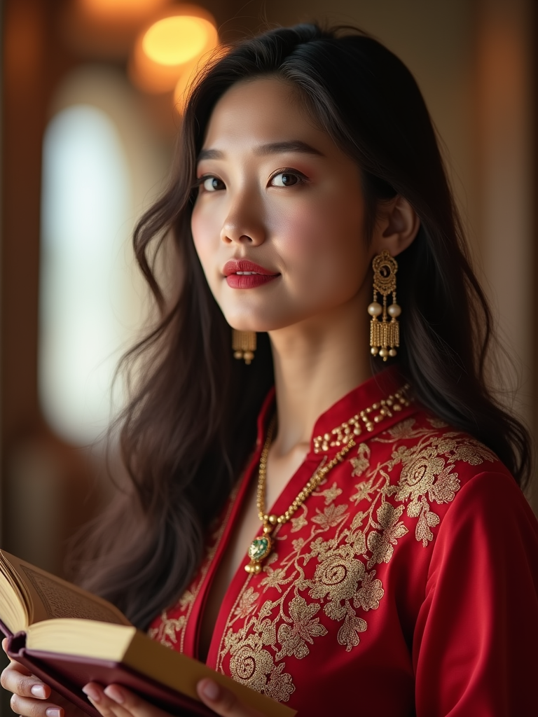 a model enjoying the Ramadan atmosphere, with hands decorated with henna and holding a prayer book , radiating peace and spirituality
