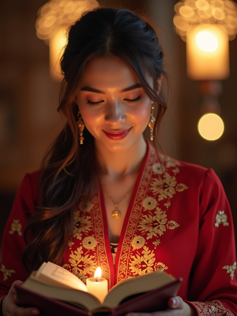 a model enjoying the Ramadan atmosphere, with hands decorated with henna and holding a prayer book , radiating peace and spirituality
