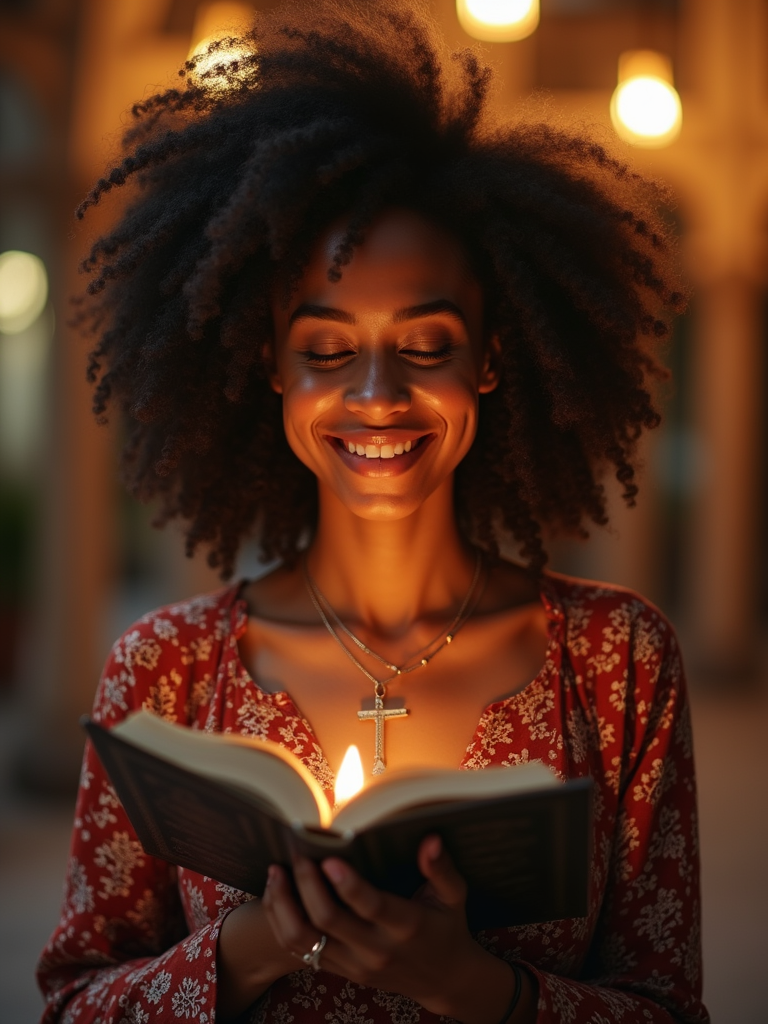 a model enjoying the Ramadan atmosphere, with hands decorated with henna and holding a prayer book , radiating peace and spirituality