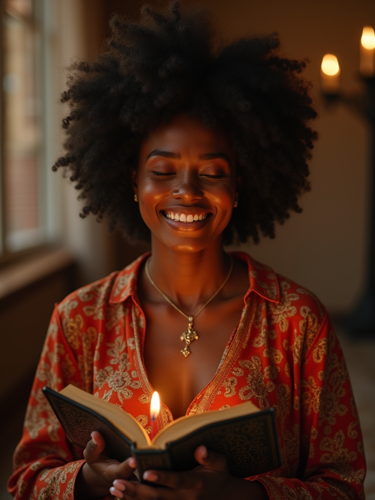a model enjoying the Ramadan atmosphere, with hands decorated with henna and holding a prayer book , radiating peace and spirituality