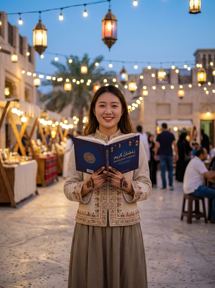 a model enjoying the Ramadan atmosphere, with hands decorated with henna and holding a prayer book , radiating peace and spirituality