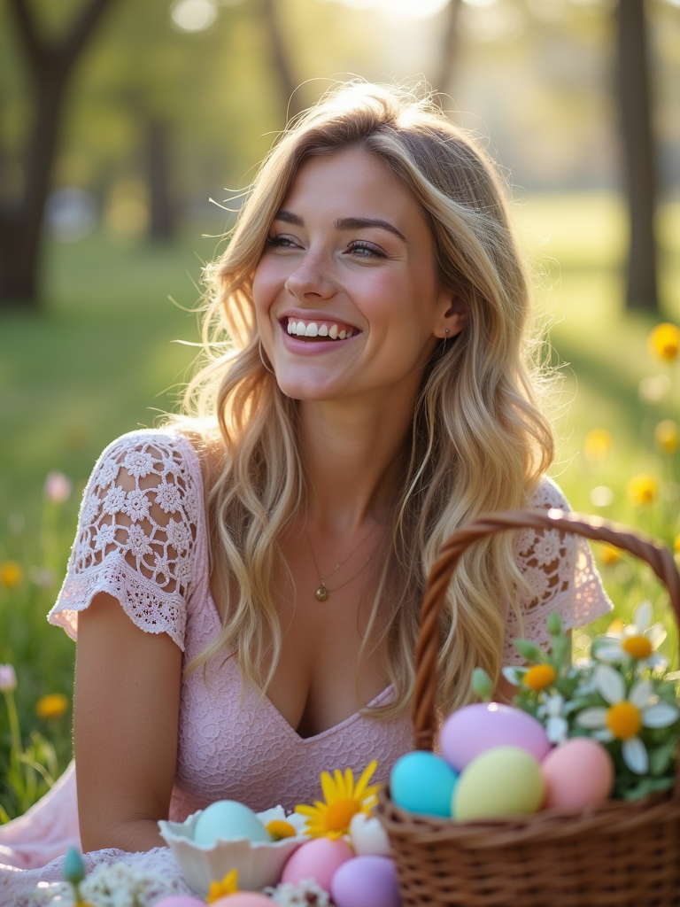 A model having a fun Easter picnic, with decorated eggs, baskets, and spring flowers in the background.