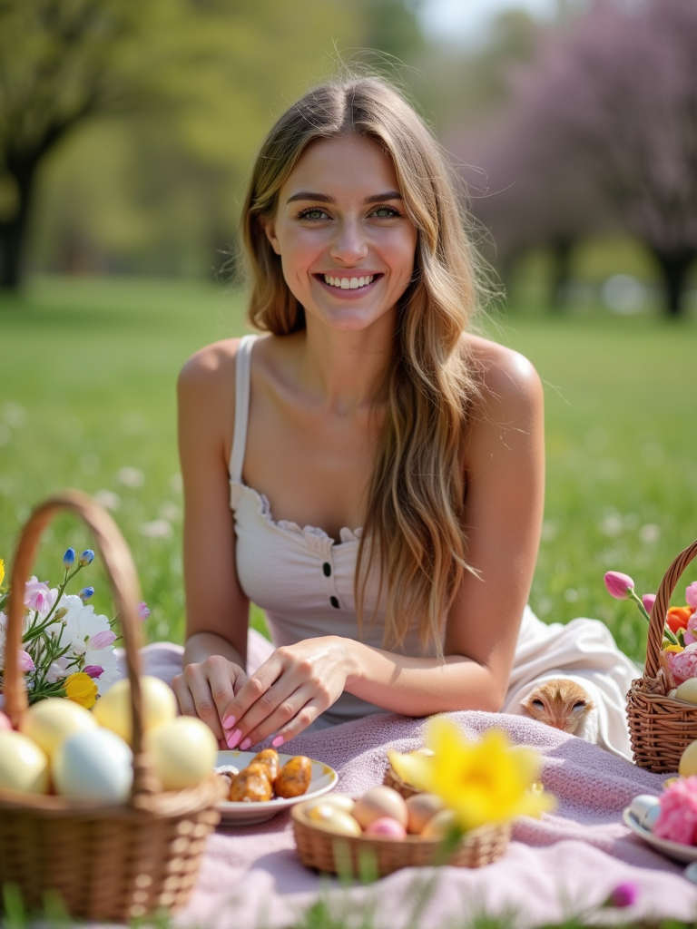 A model having a fun Easter picnic, with decorated eggs, baskets, and spring flowers in the background.