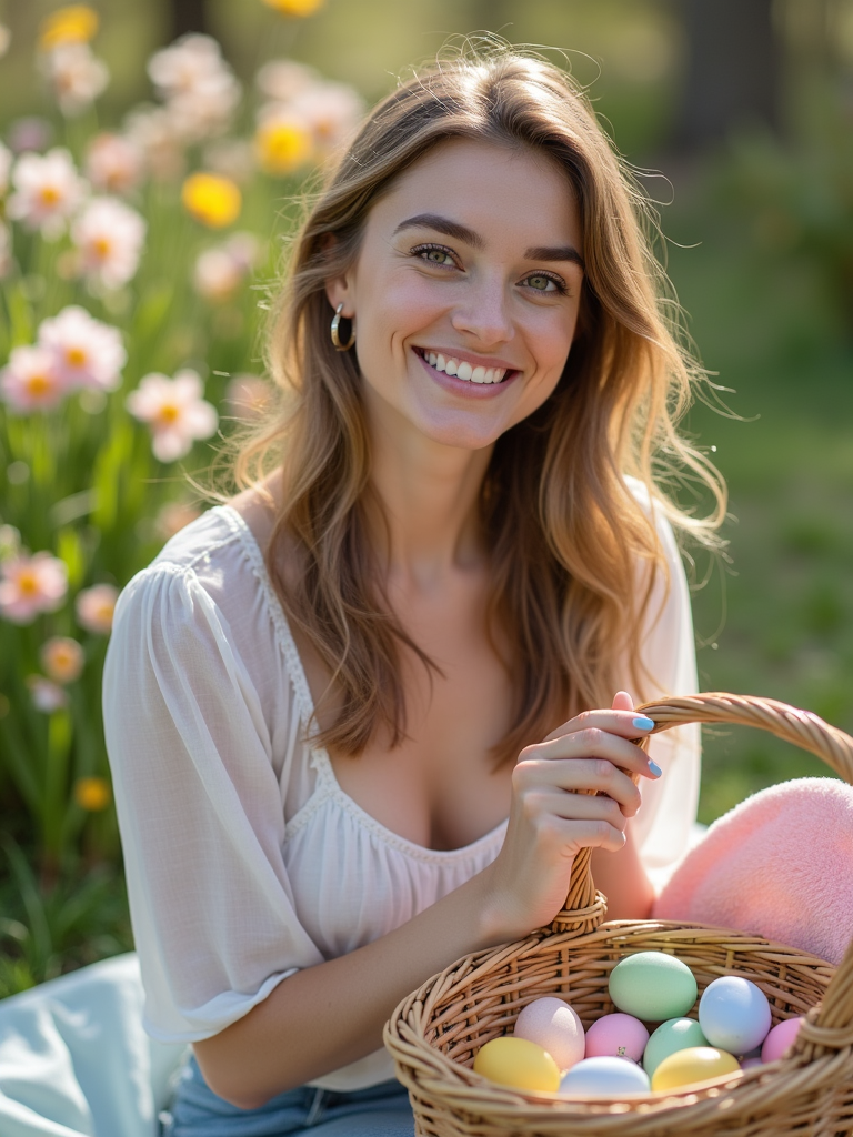 A model having a fun Easter picnic, with decorated eggs, baskets, and spring flowers in the background.