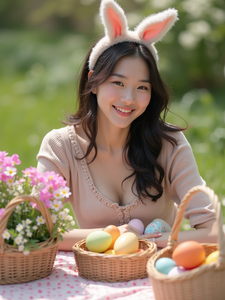 A model having a fun Easter picnic, with decorated eggs, baskets, and spring flowers in the background.