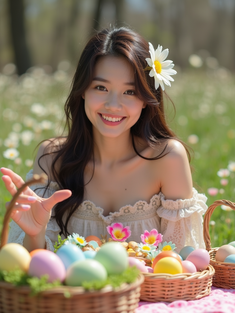 A model having a fun Easter picnic, with decorated eggs, baskets, and spring flowers in the background.