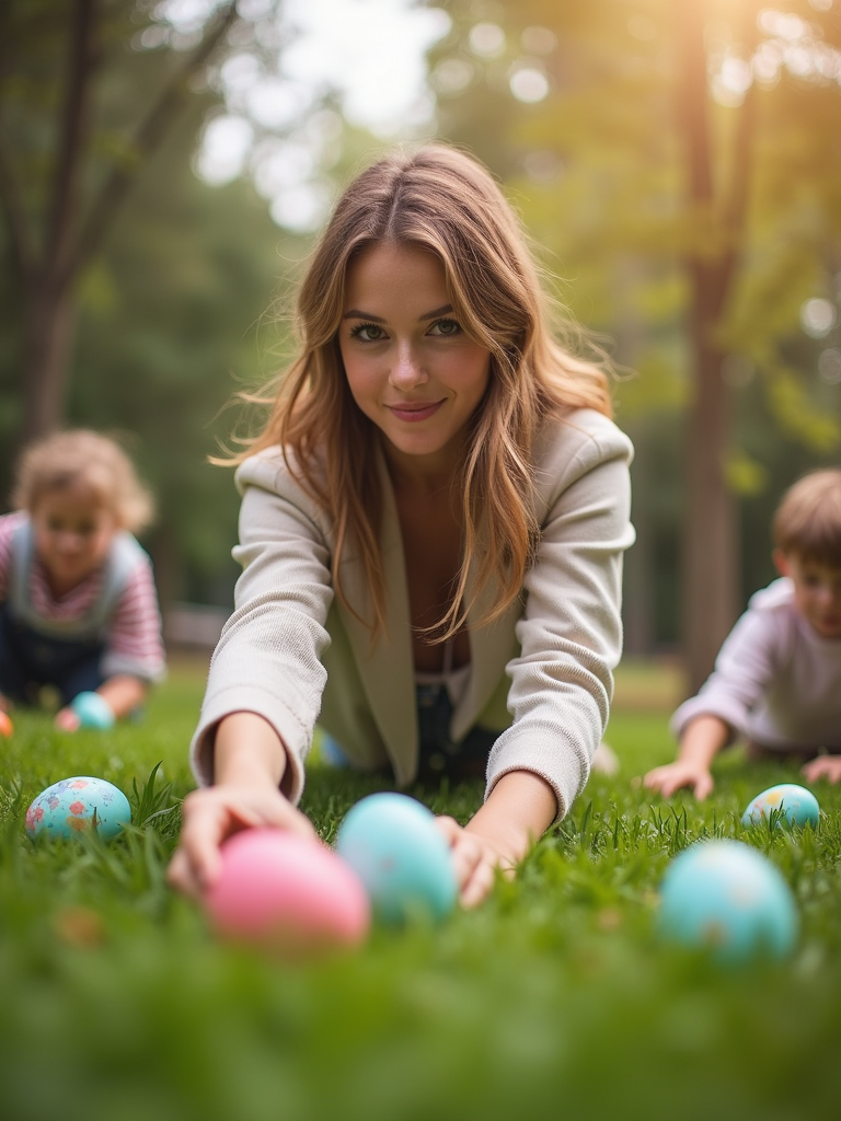 A model having an Easter egg hunt, with children searching for hidden eggs in a beautiful garden setting.