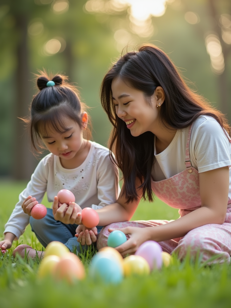 A model having an Easter egg hunt, with children searching for hidden eggs in a beautiful garden setting.