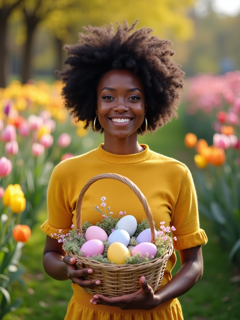A model holding a basket filled with colorful Easter eggs, standing in a vibrant garden full of spring blooms.