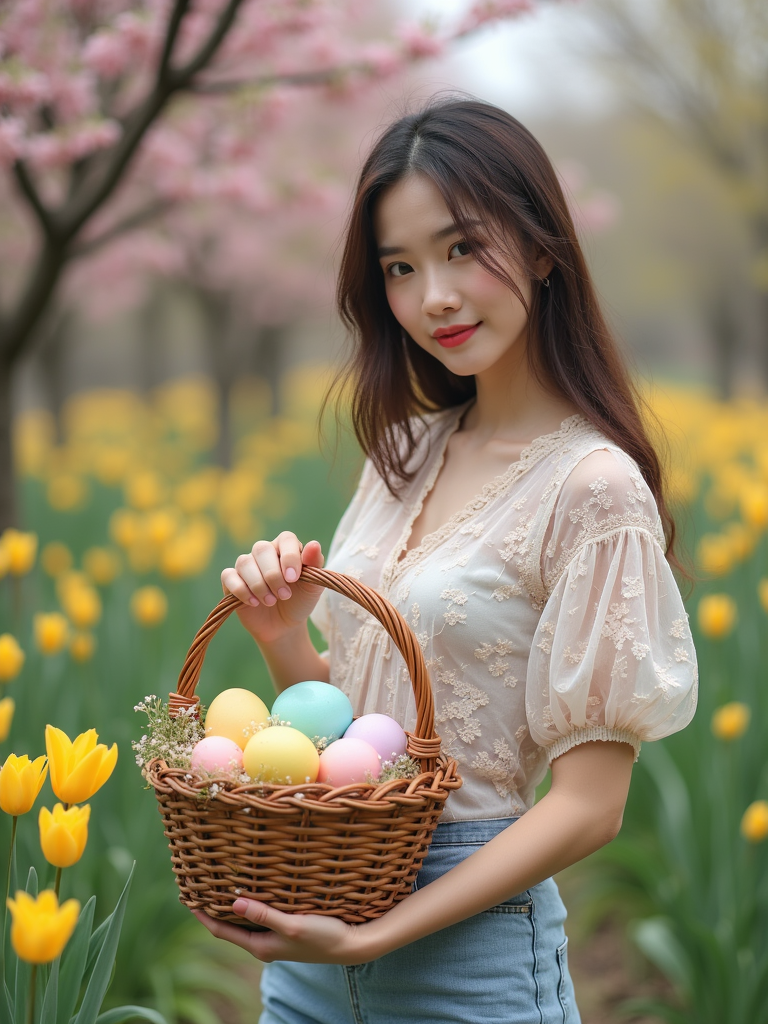 A model holding a basket filled with colorful Easter eggs, standing in a vibrant garden full of spring blooms.