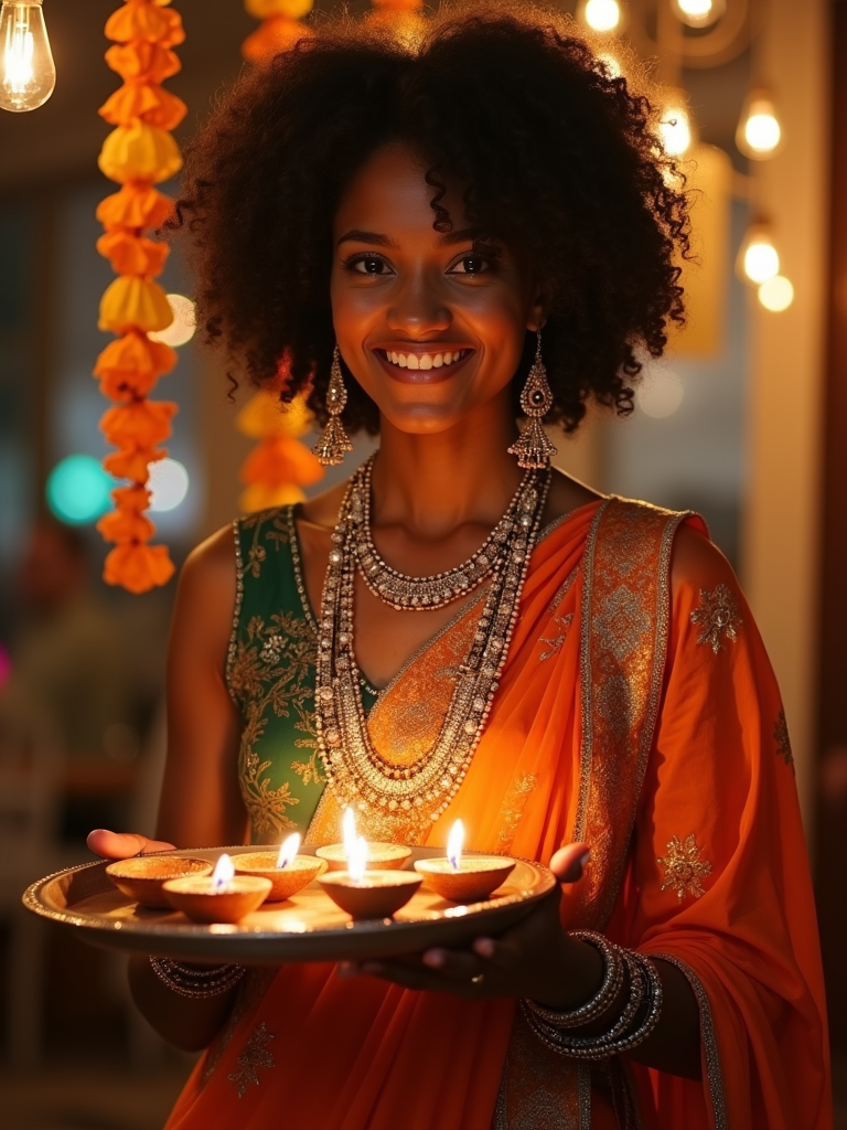 A model holding a thali (plate) with diyas, wearing ethnic attire, and smiling against a backdrop of decorative lights and marigold garlands.