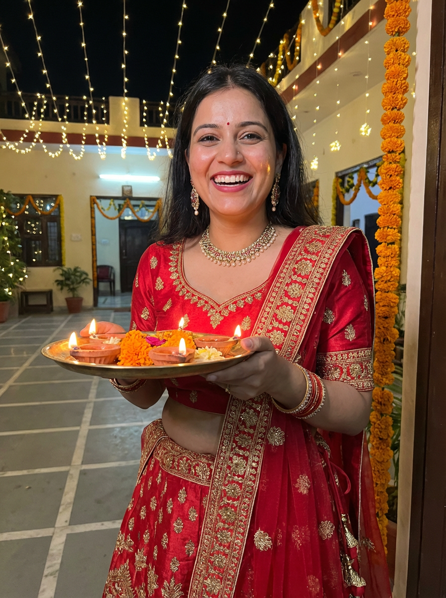 A model holding a thali (plate) with diyas, wearing ethnic attire, and smiling against a backdrop of decorative lights and marigold garlands.
