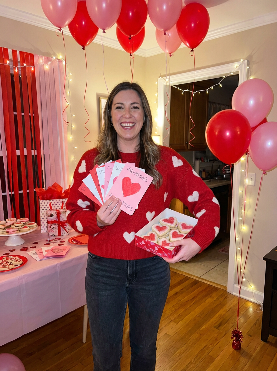A model holding Valentine's cards and heart-shaped treats in a fun, festive Valentine's setting.
