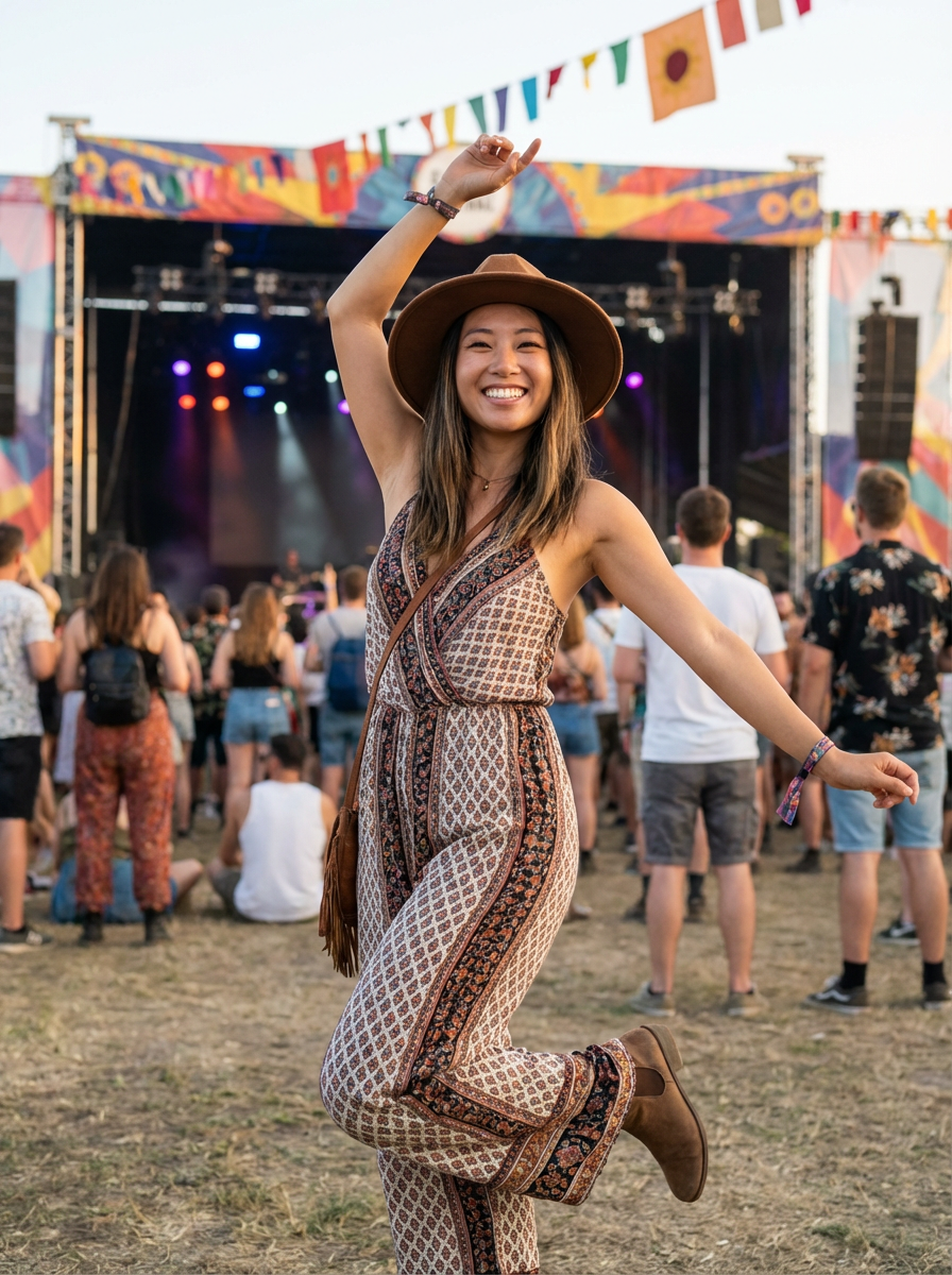 a model in a bohemian jumpsuit and a wide-brimmed hat , striking a pose in front of a stage backdrop, capturing the excitement of a music festival