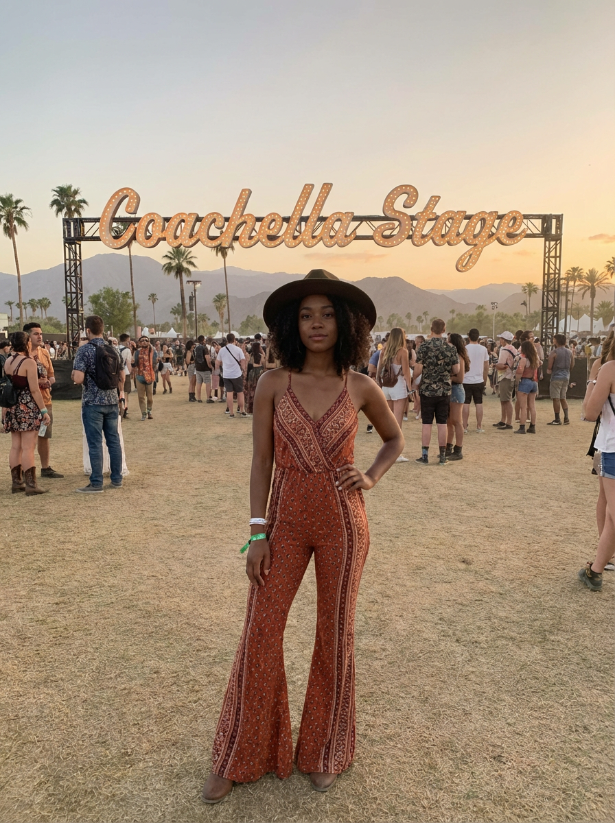 a model in a bohemian jumpsuit and a wide-brimmed hat , striking a pose in front of the Coachella stage, with palm trees and desert landscape visible