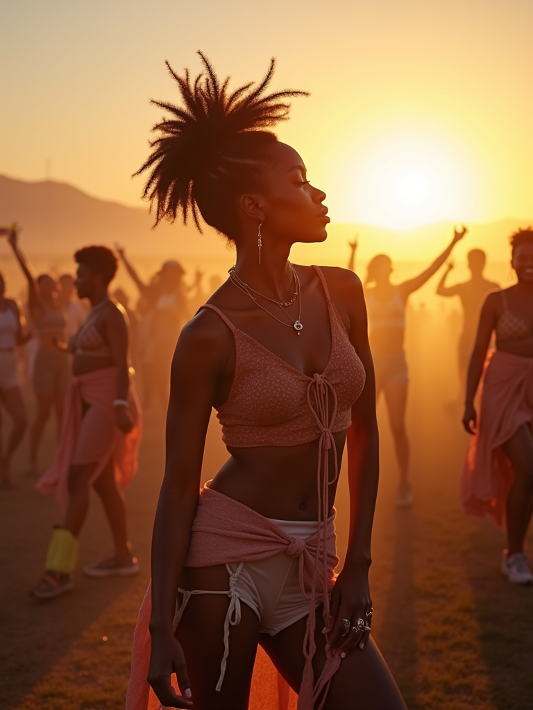 a model in a Coachella-inspired outfit, dancing with a group of friends , capturing the energetic atmosphere of the main stage at sunset