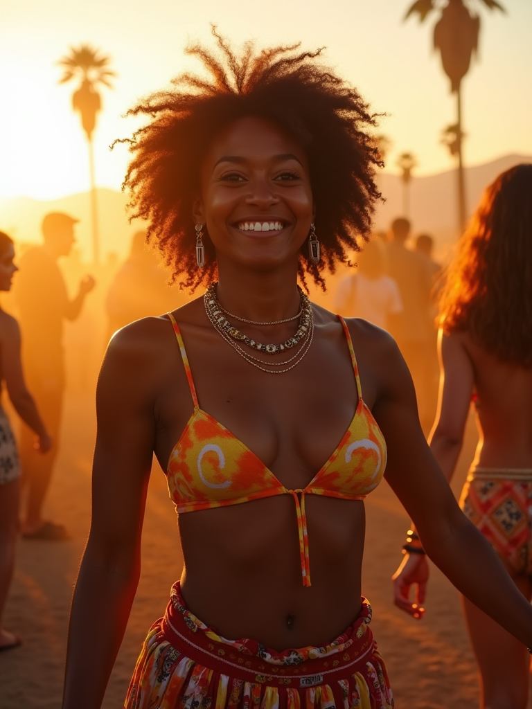 a model in a Coachella-inspired outfit, dancing with a group of friends , capturing the energetic atmosphere of the main stage at sunset