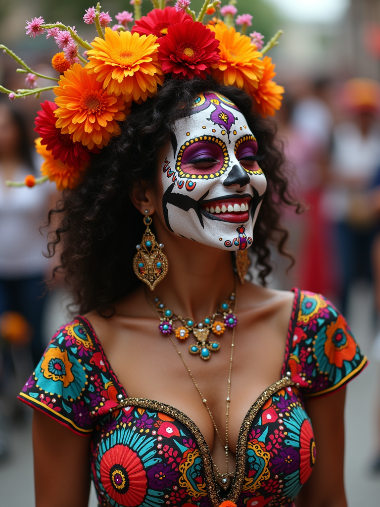 a model in a colorful traditional dress with skull motifs , capturing their joyful energy during the celebrations, with sugar skulls and marigold decorations