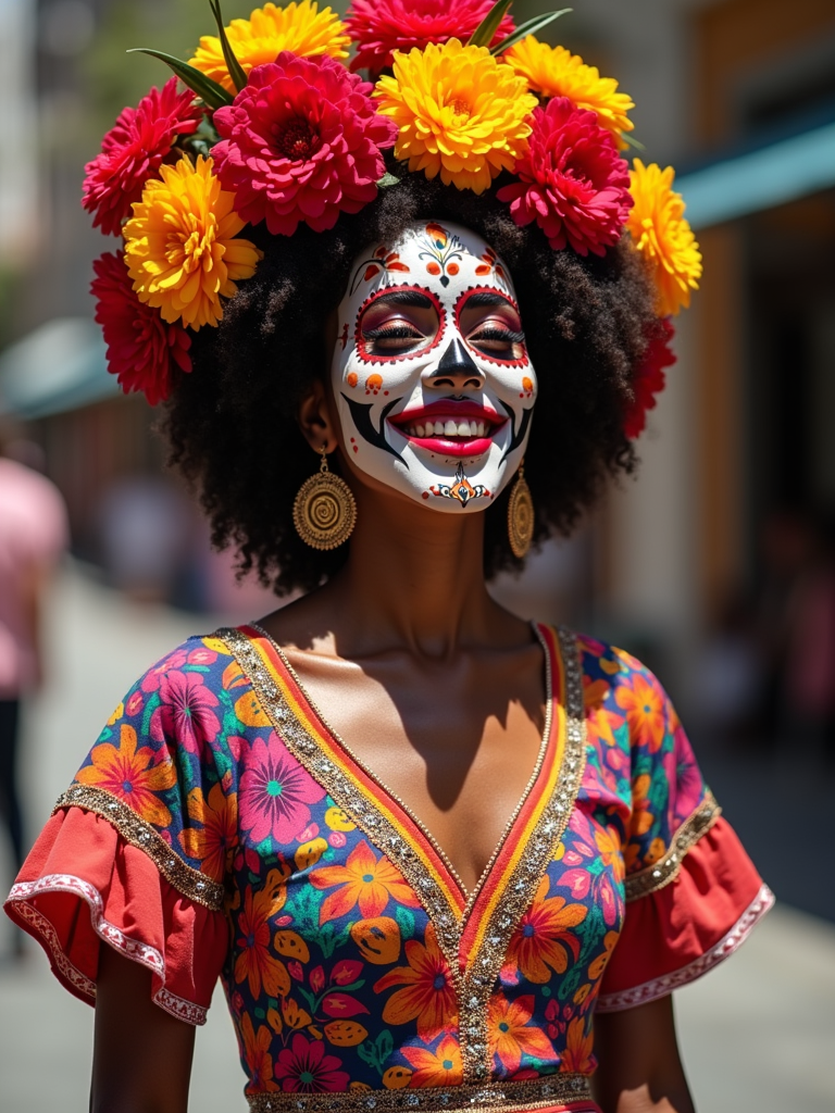 a model in a colorful traditional dress with skull motifs , capturing their joyful energy during the celebrations, with sugar skulls and marigold decorations