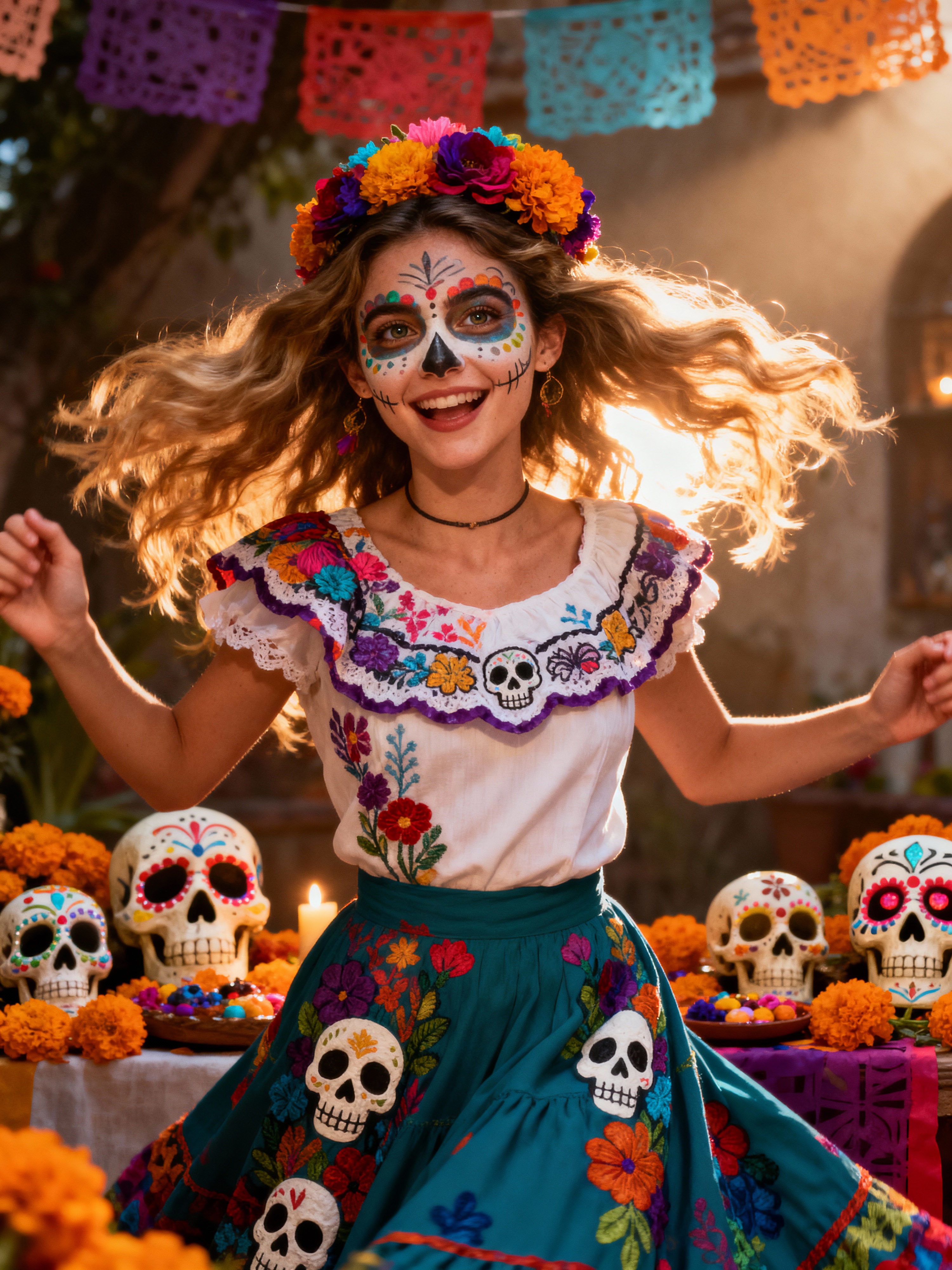 a model in a colorful traditional dress with skull motifs , capturing their joyful energy during the celebrations, with sugar skulls and marigold decorations