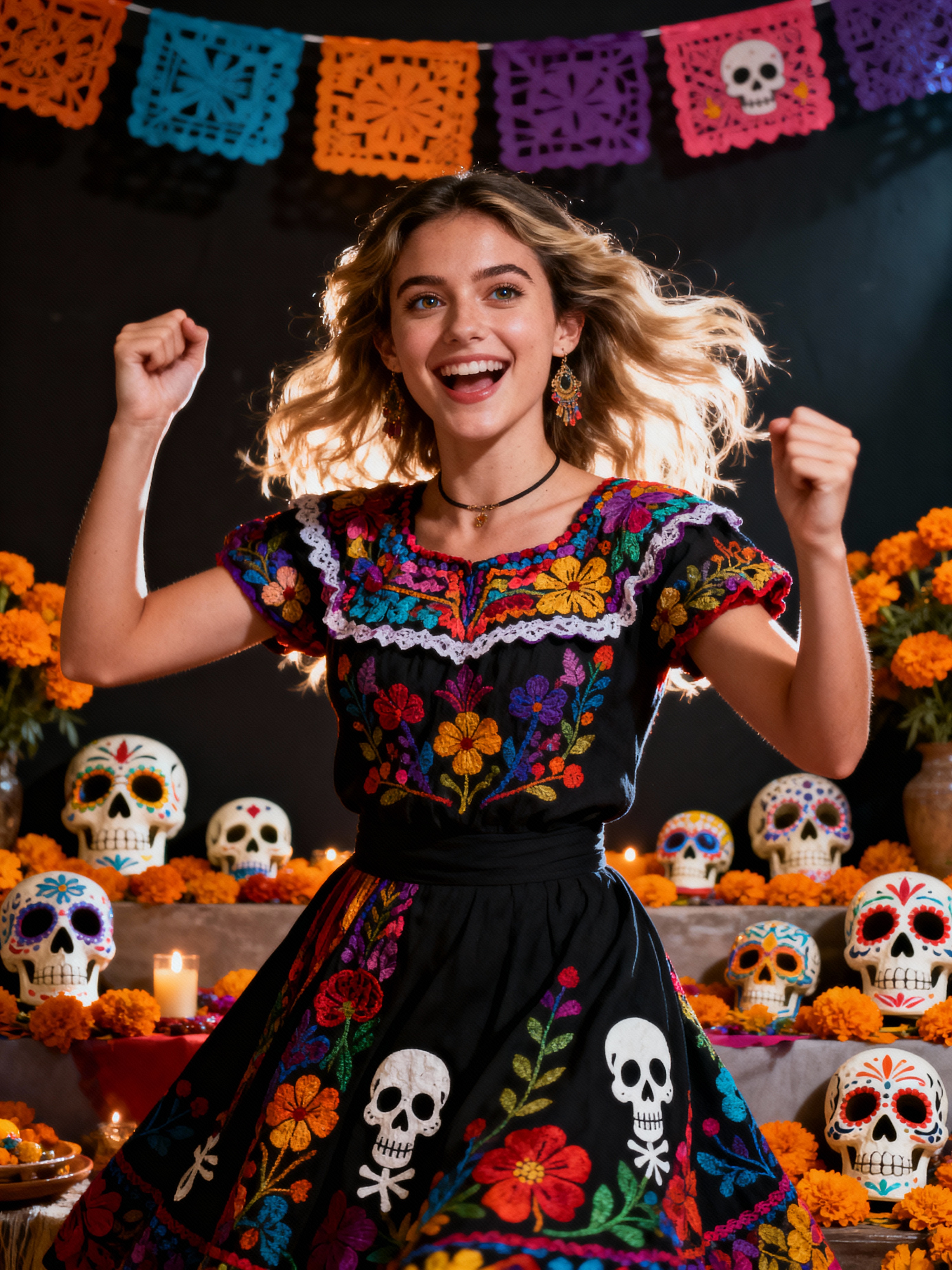 a model in a colorful traditional dress with skull motifs , capturing their joyful energy during the celebrations, with sugar skulls and marigold decorations