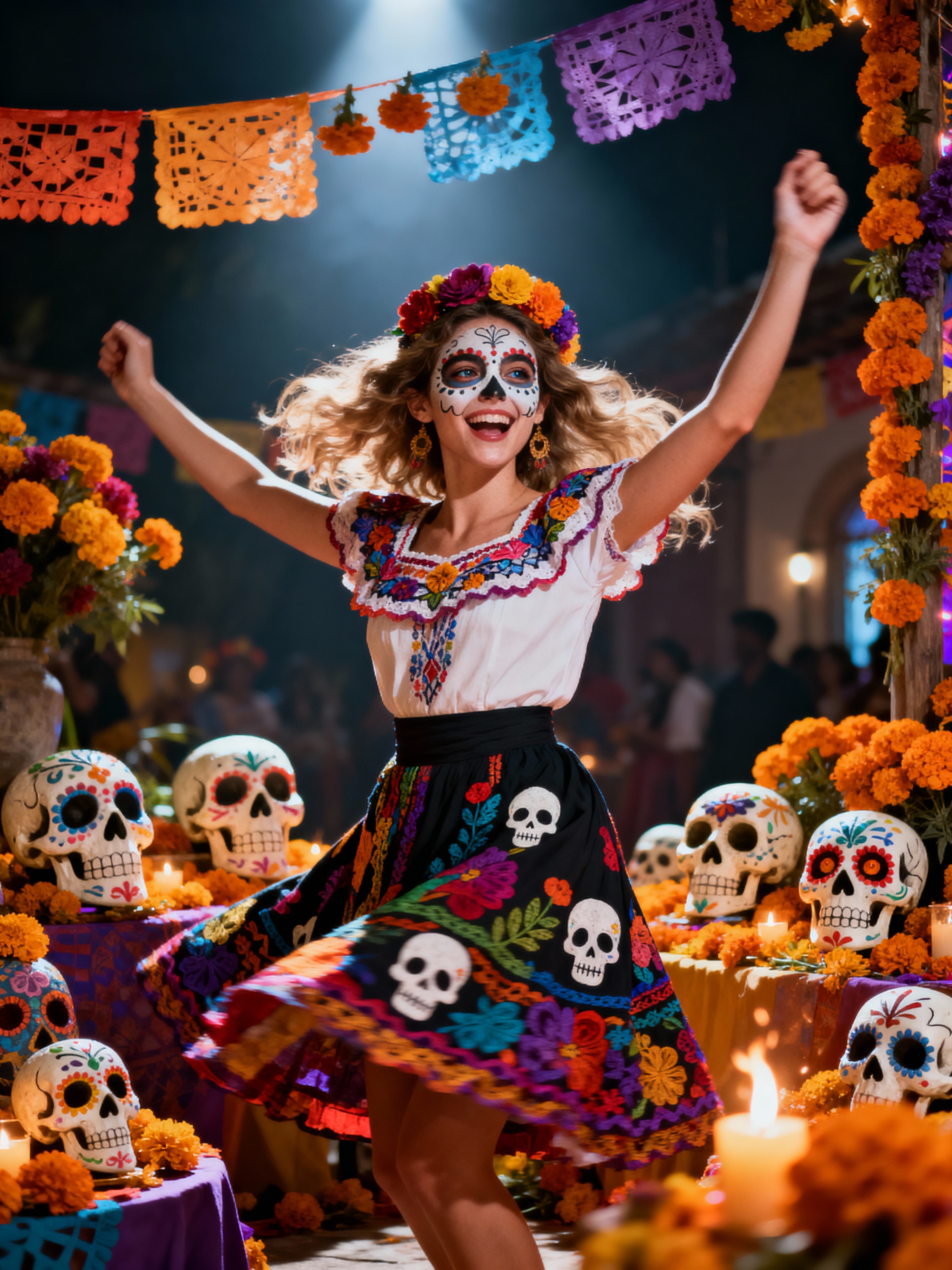 a model in a colorful traditional dress with skull motifs , capturing their joyful energy during the celebrations, with sugar skulls and marigold decorations
